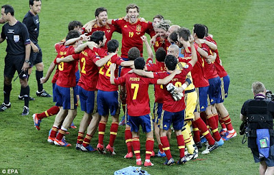 Spanyol akhirnya mencetak sejarah baru sebagai negara pertama yang berhasil mempertahankan gelar juara Piala Eropa, setelah mengandaskan perlawanan Italia 4 gol tanpa balas, di final yang digelar di Olimpic Stadium, di Kota Kiev, Ukraina, Senin (2/7/2012)Empat gol kemenangan Spanyol masing-masing dicetak oleh oleh David Silva di menit ke-14, Jordi Alba di menit ke-41, serta dua gol tambahan di babak kedua dari kaki Fernando Torres dan Juan Mata.